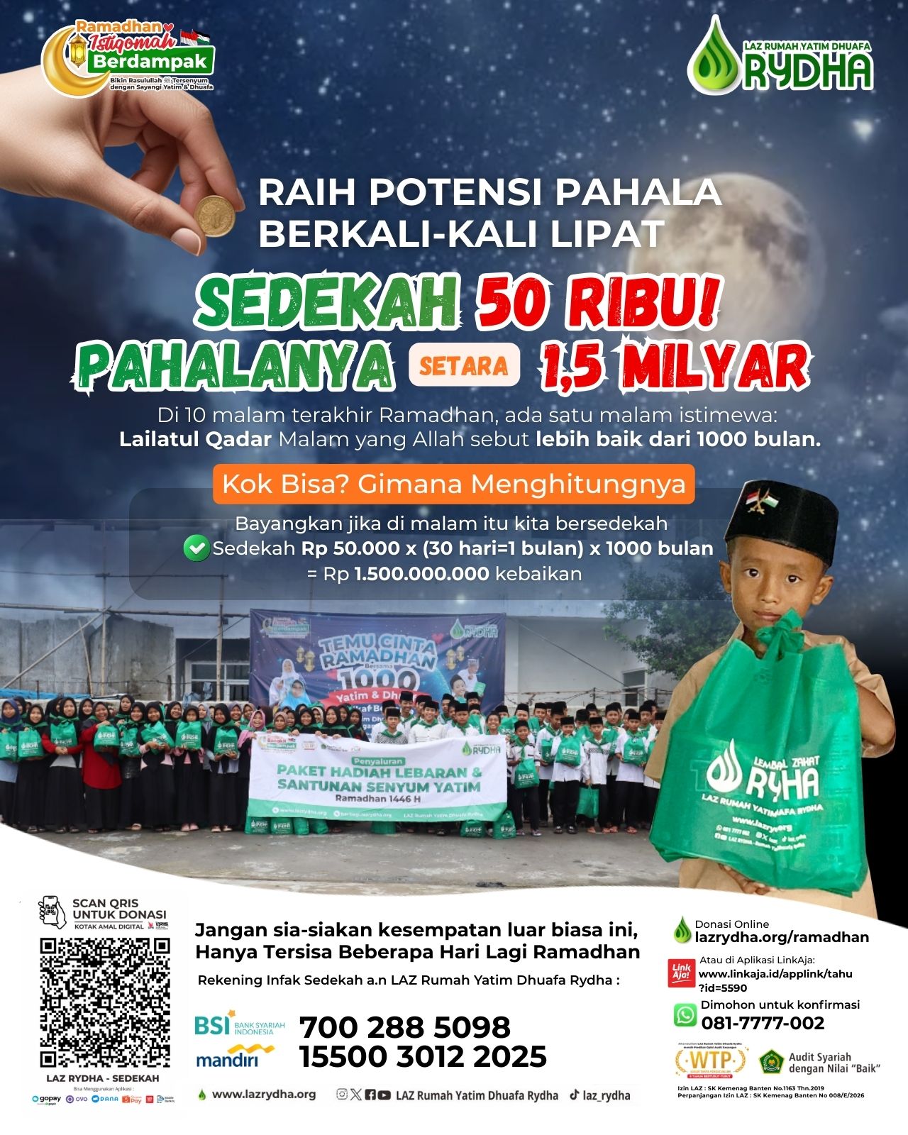 Lembaga Amil Zakat RYDHA mengajak Anda untuk tidak melewatkan momentum emas ini. Mengapa angka 1,5 Miliar? Secara logika, jika kita istiqomah bersedekah di malam mulia tersebut, pahalanya dilipatgandakan seolah-olah kita melakukannya selama 30.000 hari atau 83 tahun tanpa henti.